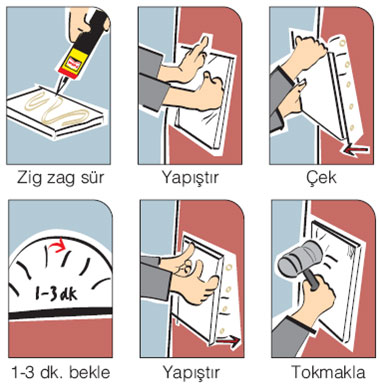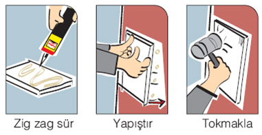 - Yapıştırılacak yüzey boyunca yaklaşık 6 mm kalınlığında zig zag şeritler halinde uygulanmalıdır. Yapıştırma yapılacak yüzeye pres yapılmalıdır, yüzeye eşit pres uygulanmalıdır. Tutunma anında gerçekleşir, montaj tamamlanmıştır.